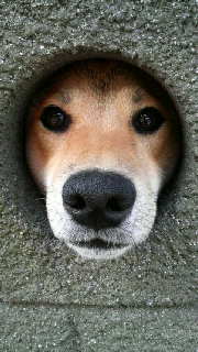 何だか変わった ワンコです。いつも玄関で何か咥えて・・・・車が上ってくるのを待ち構えて興奮してくるくる回ってます~。今日は私と息子でこの坂を上ってると・・・相変わらず構えてました~^m^ で・・・ブロックの間からお顔出してポーズしてました!