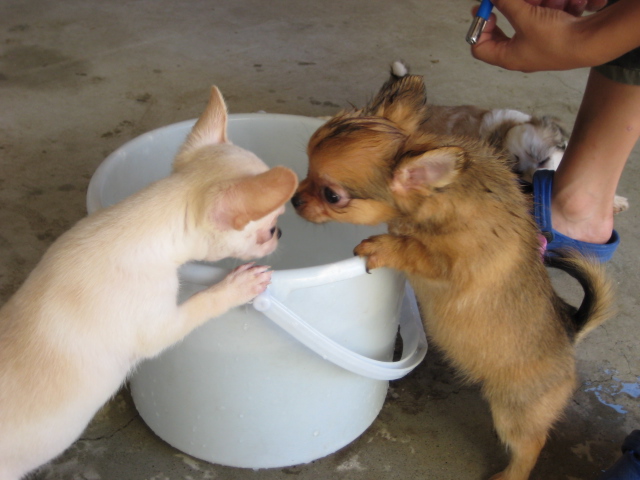 あまりの暑さで、ポエムとマリンはバケツに手を置いてなにやら???