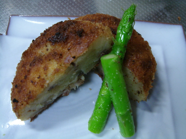 つぶしたジャガイモの中に入れて塩コショーして混ぜ混ぜして丸めてコロッケに!!